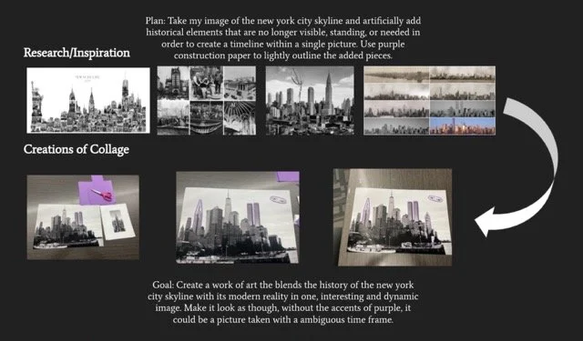 My investigation went through multiple brainstorming and revision phases during this year-long process. I began my journey exploring New York City through the eyes of a film camera. Using these images, I juxtaposed the raw moments I captured with similar instances decades or centuries beforehand. However, I wanted to take those side-by-side inquiries and shape them into a more dynamic singular picture. Therefore, I started researching the ways both photoshop and traditional glue-and-scissor collages could help me achieve my end goal: showcasing the similarities between the past and present.