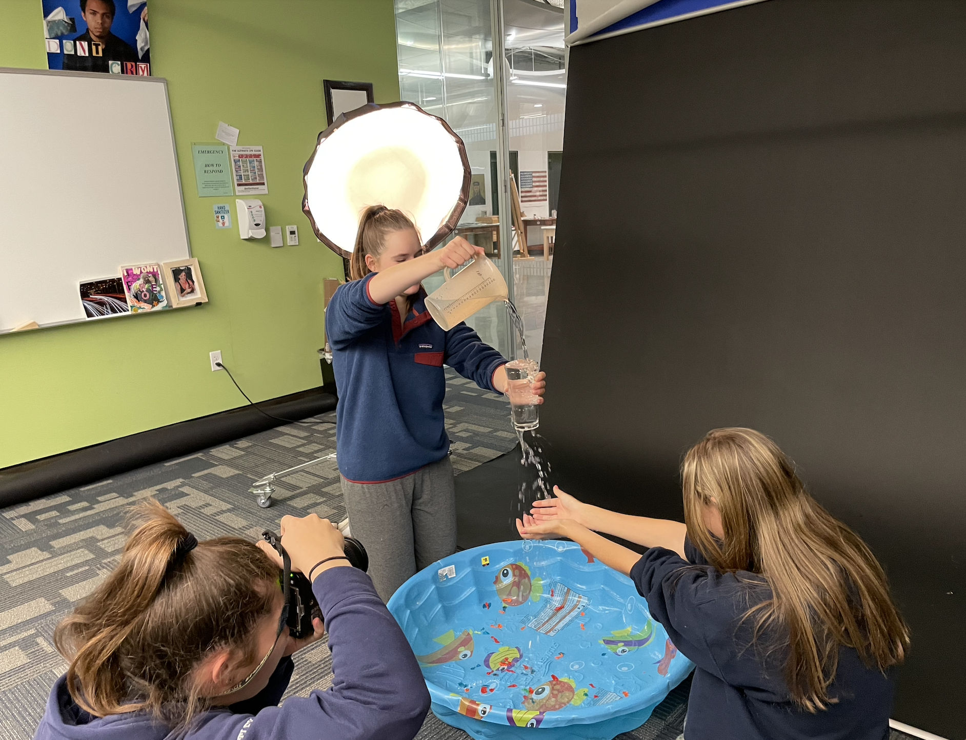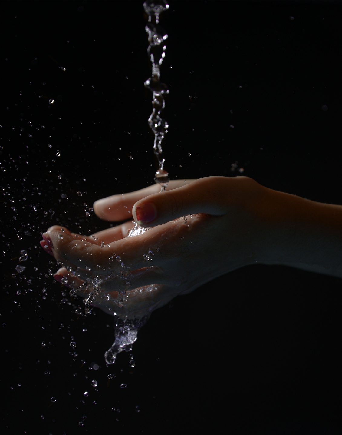 Set up pool in front of a black background. In order to ensure a black backround the pool must be far away from the physical black screen so no light will be angled onto the background only the models hands. Ensure that the light is above and angled down at the pool. Have the light set at 5.8. Set your shutter speed high as to freeze the splashing water droplets.