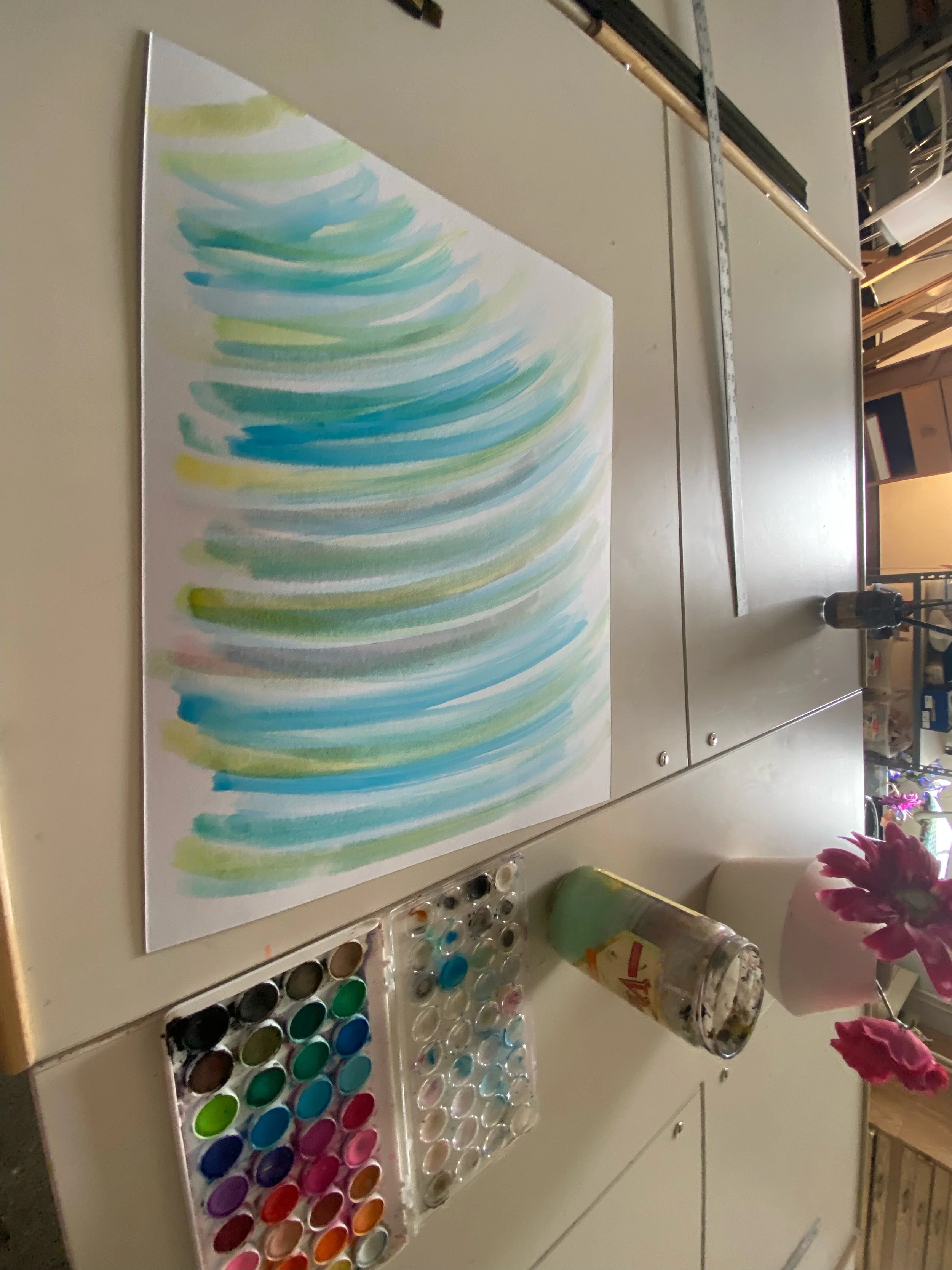 3- For the background of the board, consider giving it a texture or paint background. I created a background by splattering watercolor and painting big brush strokes in order to a color background. Wait around 20 minutes for the board to dry to then start the college.