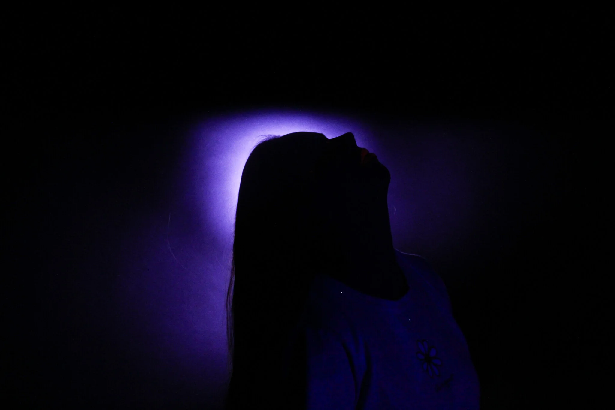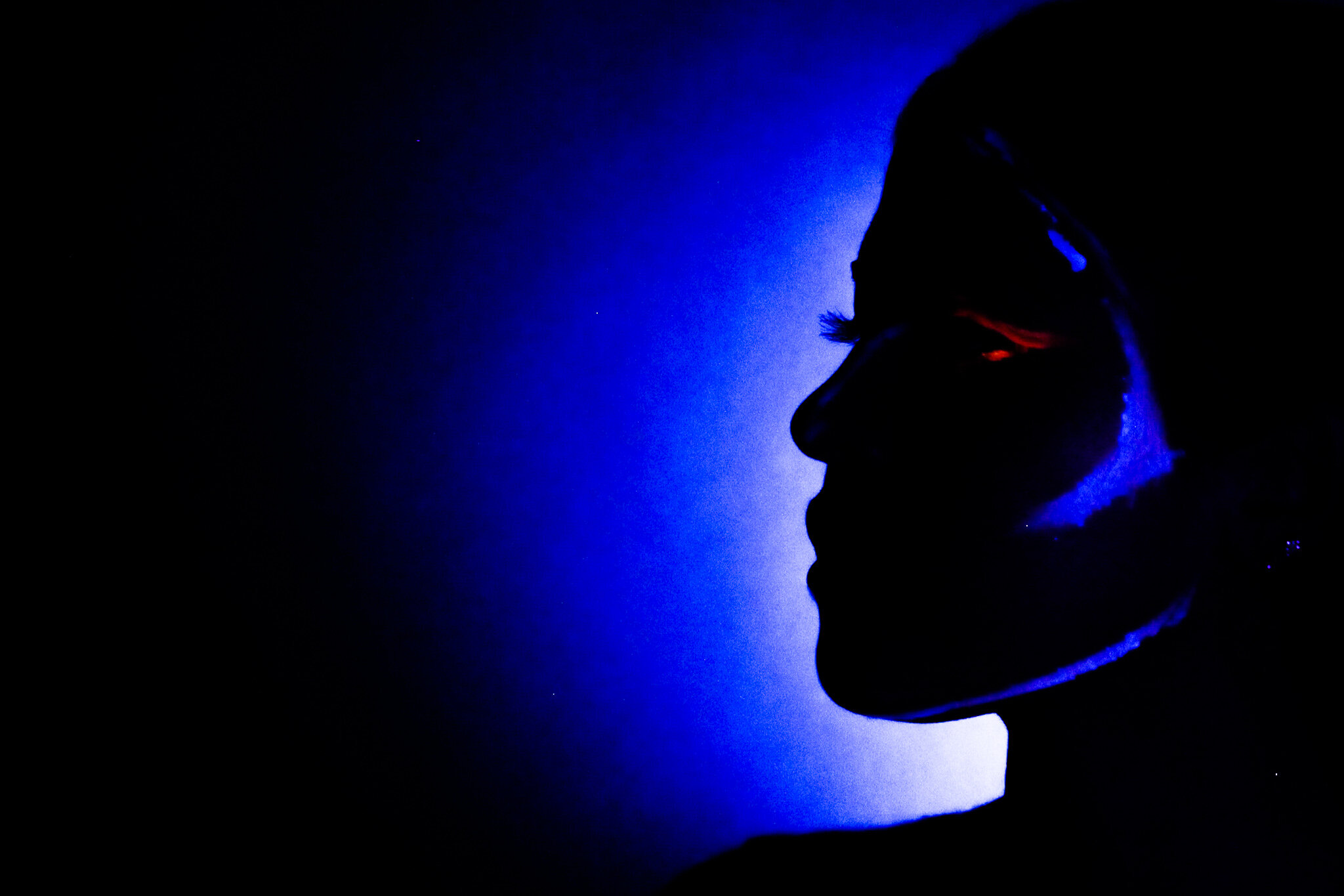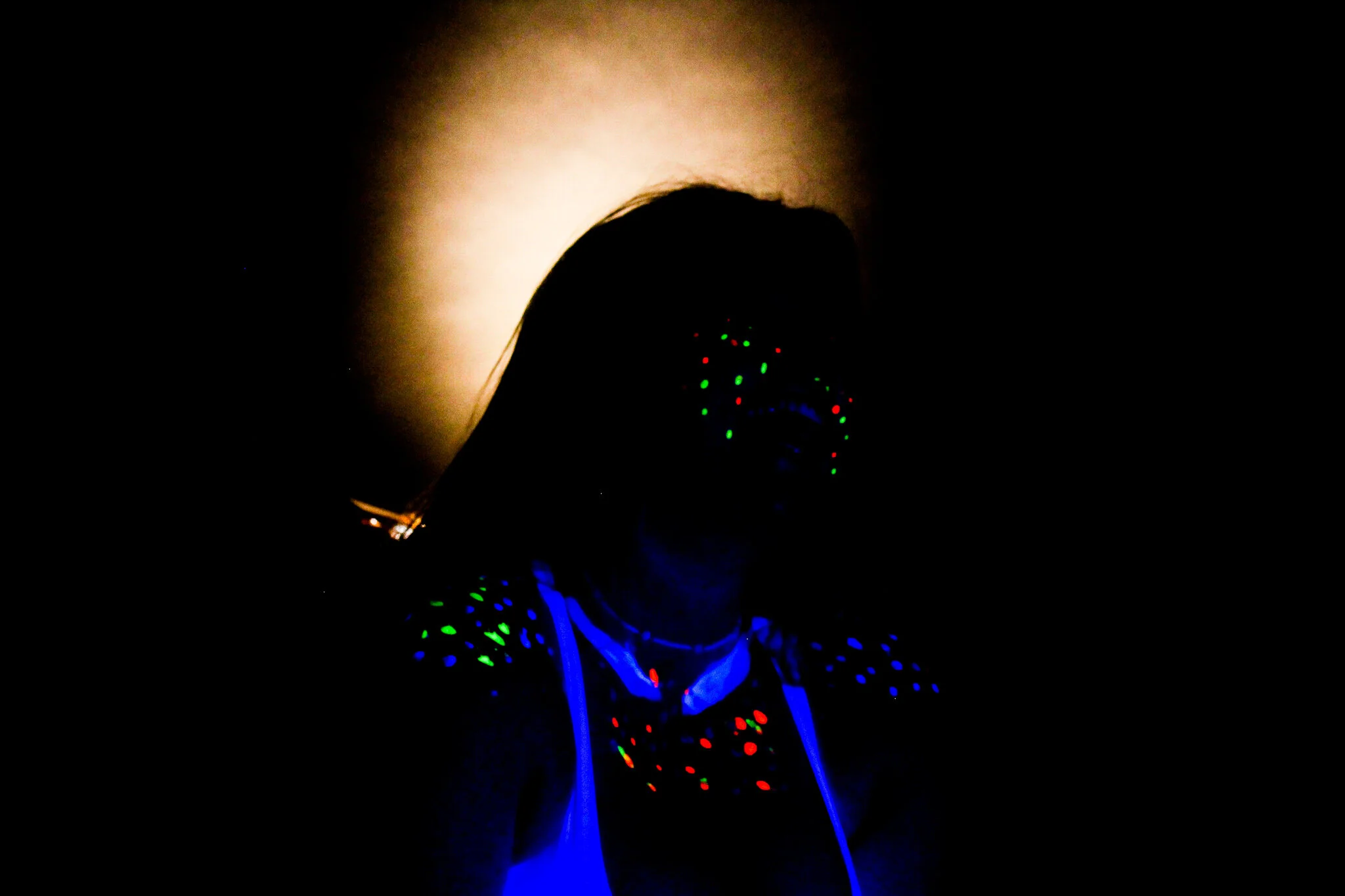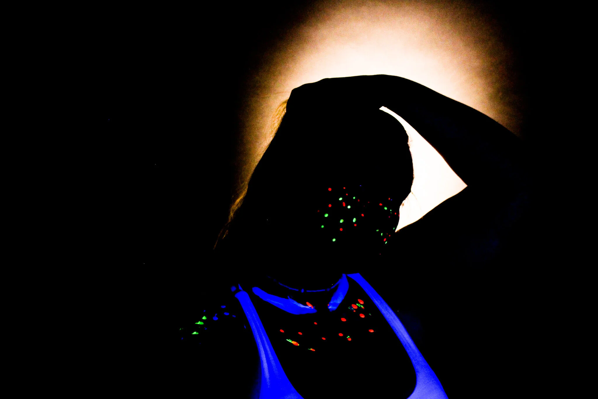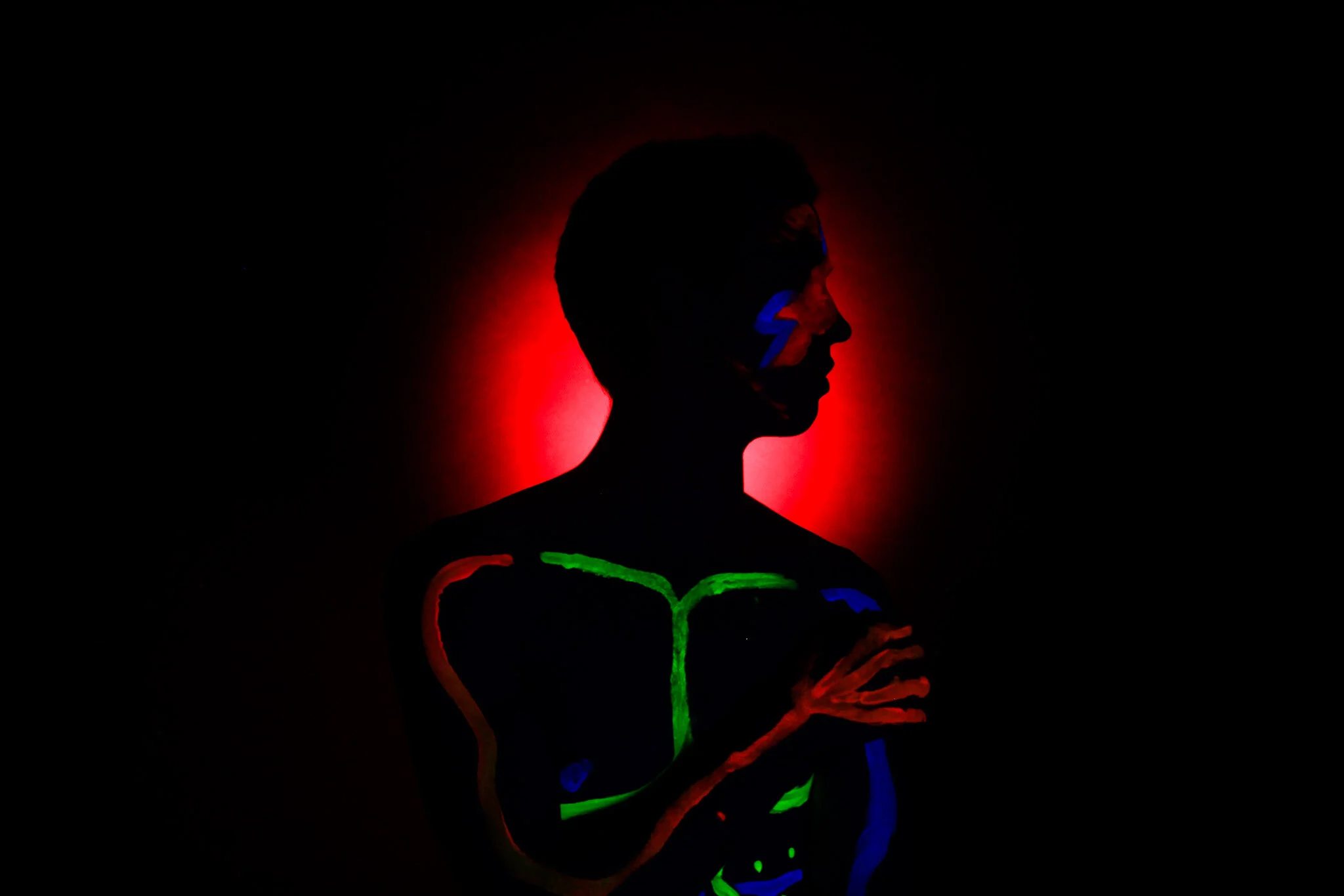 In this photo, the UV light was too close to the subject, which illuminated natural highlights of the skin and lost the silhouette effect.