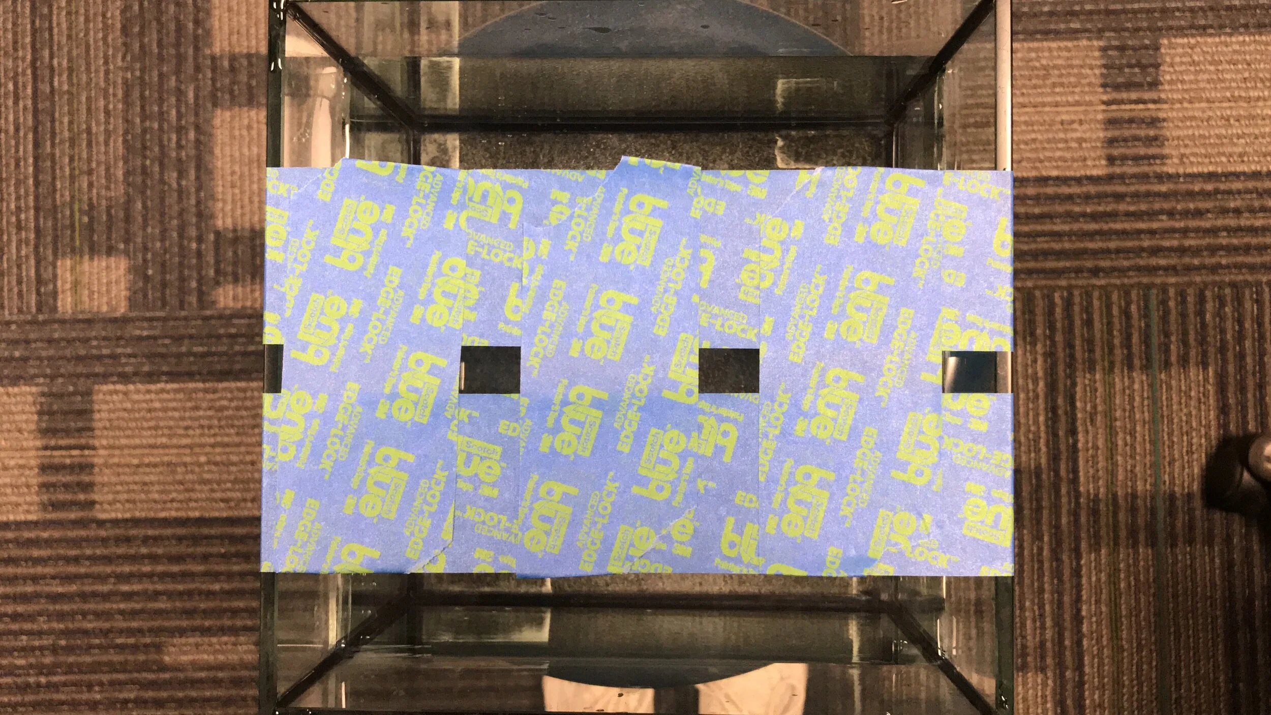 5.1 Place 2 pieces of tape across the top of the tank horizontally like shown in the picture on the left. The gap in between the two tape should be in the center of the tank (or your preference regarding the composition), and the gap should be 1.0 - 1.5 cm wide (depends on the size of the funnel).