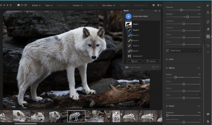 Making the background slightly darker than the subject allows the wolf (or whatever subject is in the photo) to pop off of the background. Use the “Exposure” bar to darken the background slightly. Use the “Texture” and “Sharpness” bars to add a blurring effect to the background by lowering them. Make sure you don’t darken the background too much because it will add a harsh line around the subject; darken the background just enough to draw the eye to the subject.