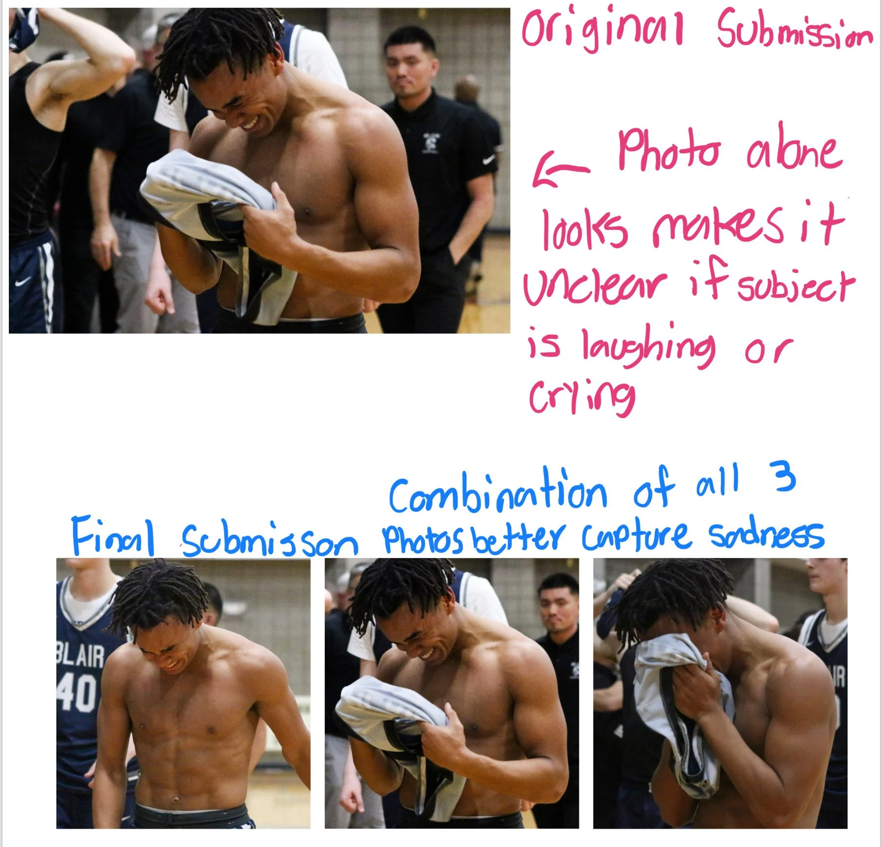 Over the nine months of my sustained investigation I took 22,576 photos. I went to 40 sporting events and averaged around 564 photos per event. I experimented with photoshop to further my investigation (14,15). I also took photos in between playing times to tell the stories that are not part of the game but make an impact (7). Upon revision, I found that while one photo can tell a story, two or three photos together can tell even bigger stories than just one (8,9,10,11)