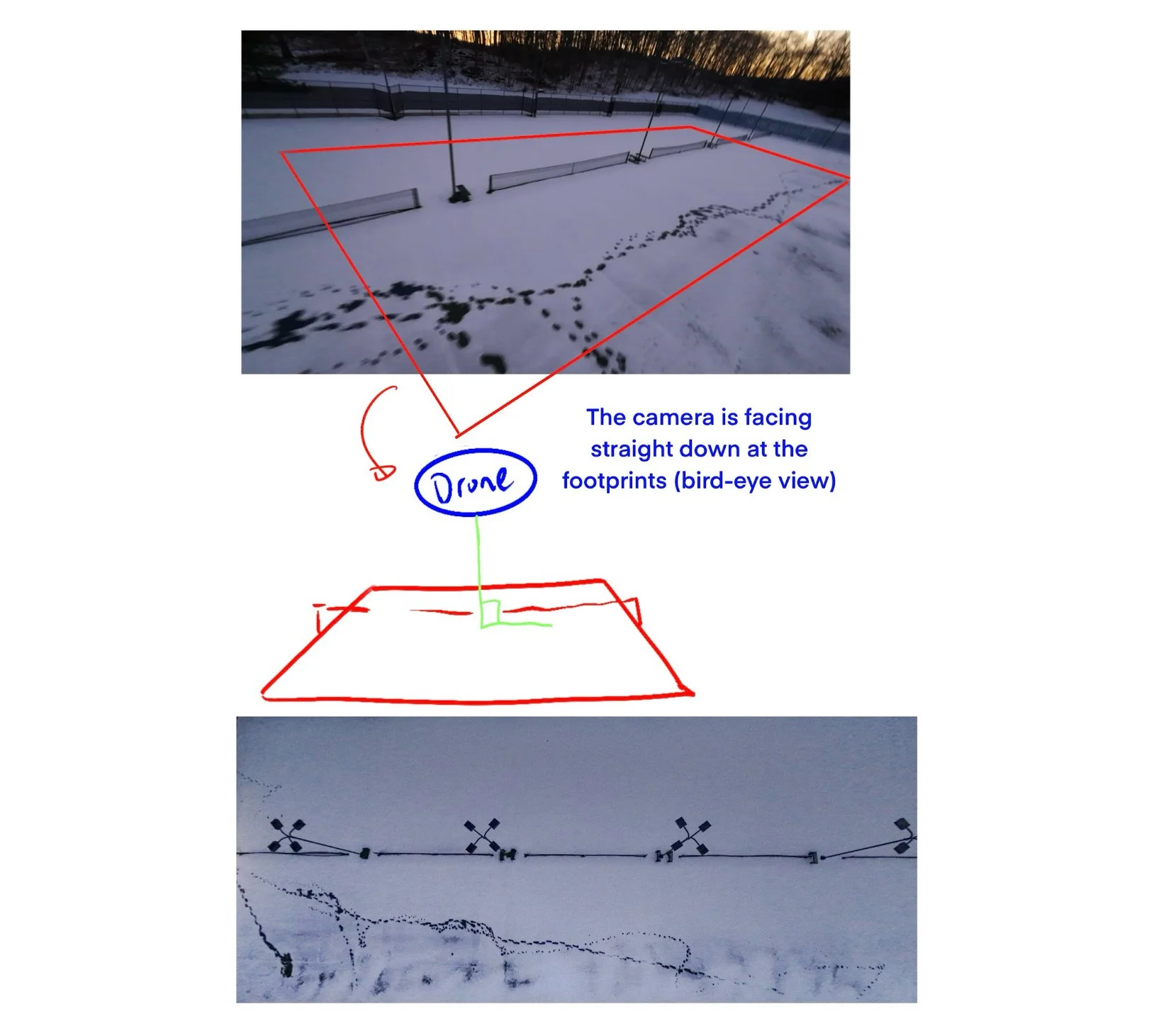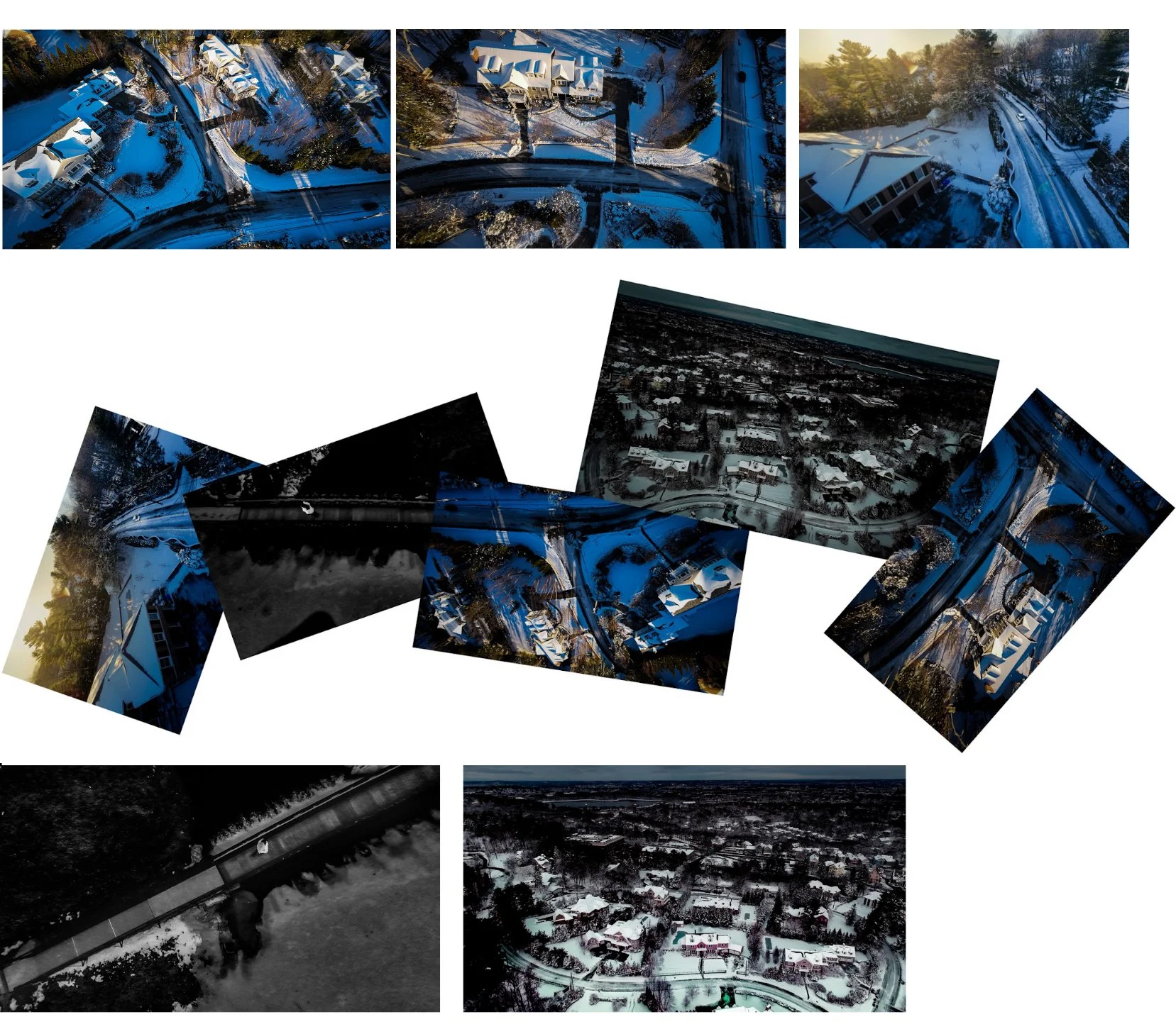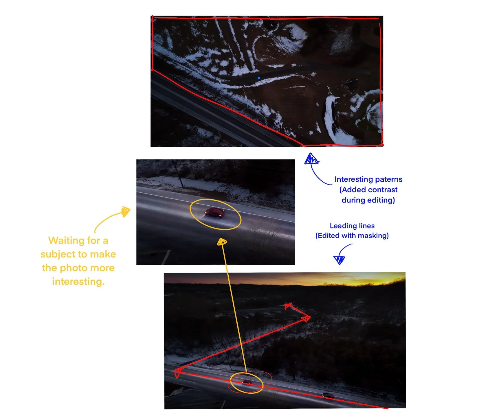 I started experimenting with the usage of drones. The drones provided me with a new perspective for my question. I rely heavily on the editing process, including using it for double exposure to combine photos and to manipulate the center focus of images. For instance, I use a masking tool in Lightroom to bring out my main subjects or the leading lines that I want the audience to focus on. SI 8 presents my process of editing through masking in detailed captions of my choices in different sections of photo. In SI 11, I first attempted to edit the color of my subject’s jacket to the color red, but the final result was not as compelling as I wanted it to be. Hence I redone my editing and changed it into black and white, which resulted better. In SI 9, I experimented with Bird's Eye view, and I was able to bring out the footprint patterns in the snow through a unique way. Lastly, in SI 13 & 14, I further experienced with altering color of photos through gradient map to further express the theme.