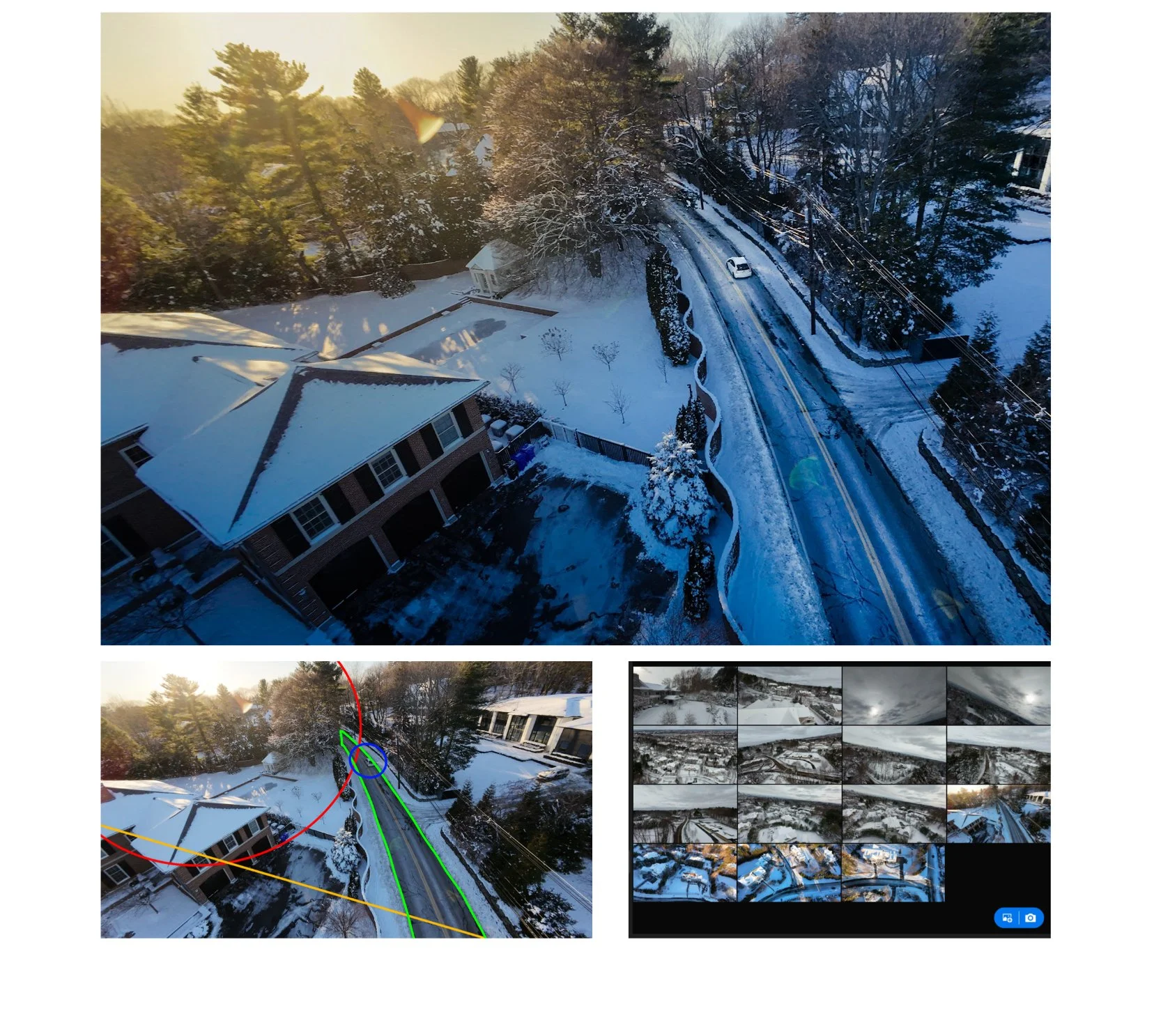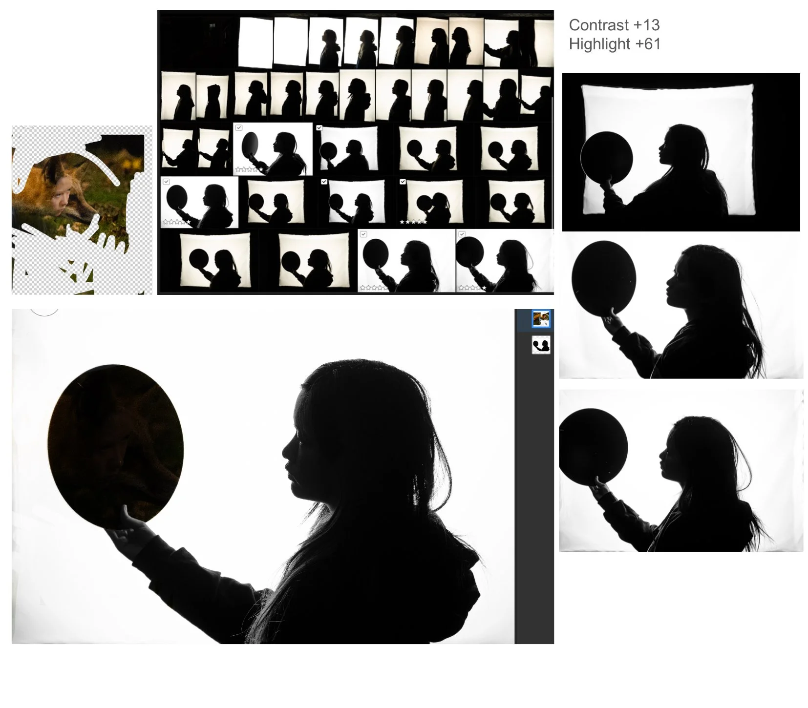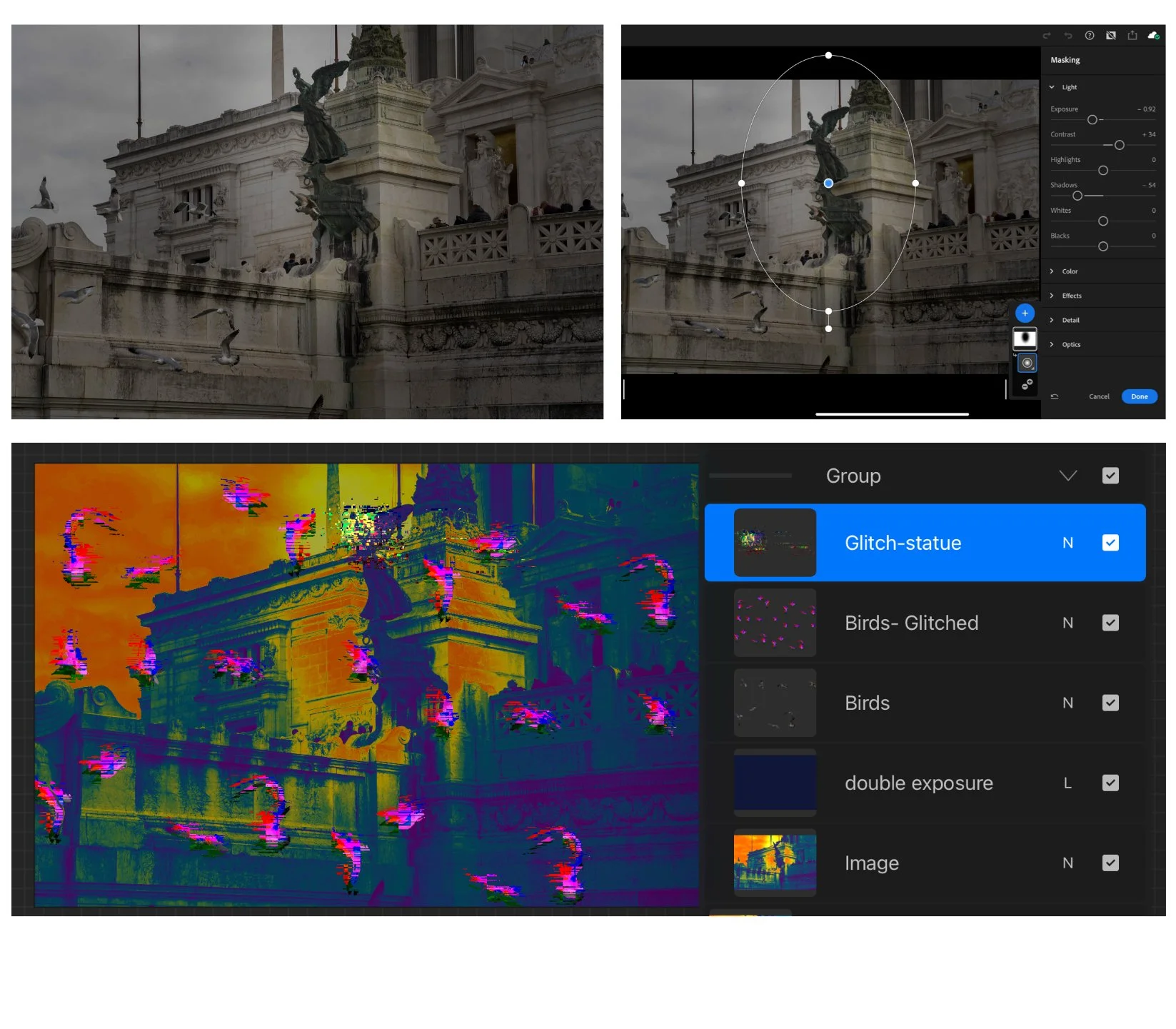 I started experimenting with the usage of drones. The drones provided me with a new perspective for my question. I rely heavily on the editing process, including using it for double exposure to combine photos and to manipulate the center focus of images. For instance, I use a masking tool in Lightroom to bring out my main subjects or the leading lines that I want the audience to focus on. SI 8 presents my process of editing through masking in detailed captions of my choices in different sections of photo. In SI 11, I first attempted to edit the color of my subject’s jacket to the color red, but the final result was not as compelling as I wanted it to be. Hence I redone my editing and changed it into black and white, which resulted better. In SI 9, I experimented with Bird's Eye view, and I was able to bring out the footprint patterns in the snow through a unique way. Lastly, in SI 13 & 14, I further experienced with altering color of photos through gradient map to further express the theme.