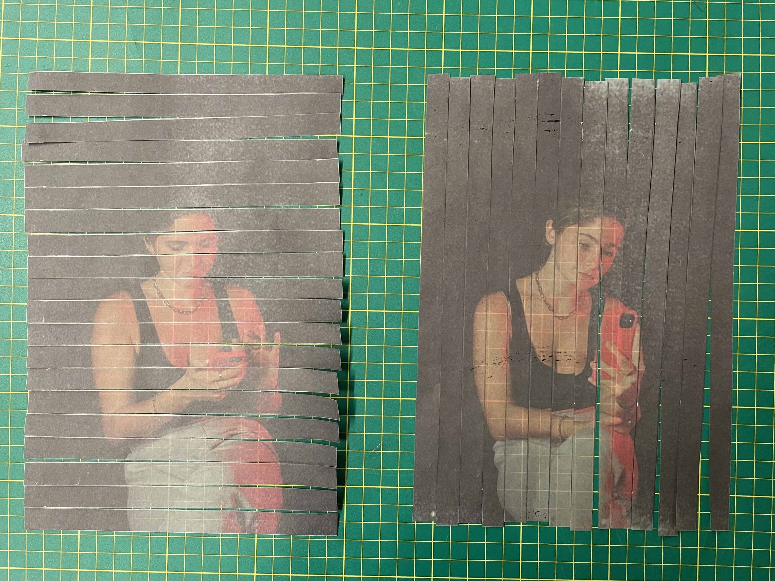 Step 2: Cut along the lines you drew (you can use an x-acto knife and cutting board and ruler, but please be careful!). As you cut, place your horizontal strips on a piece of paper. (You can use tape to hold down the strips of paper)