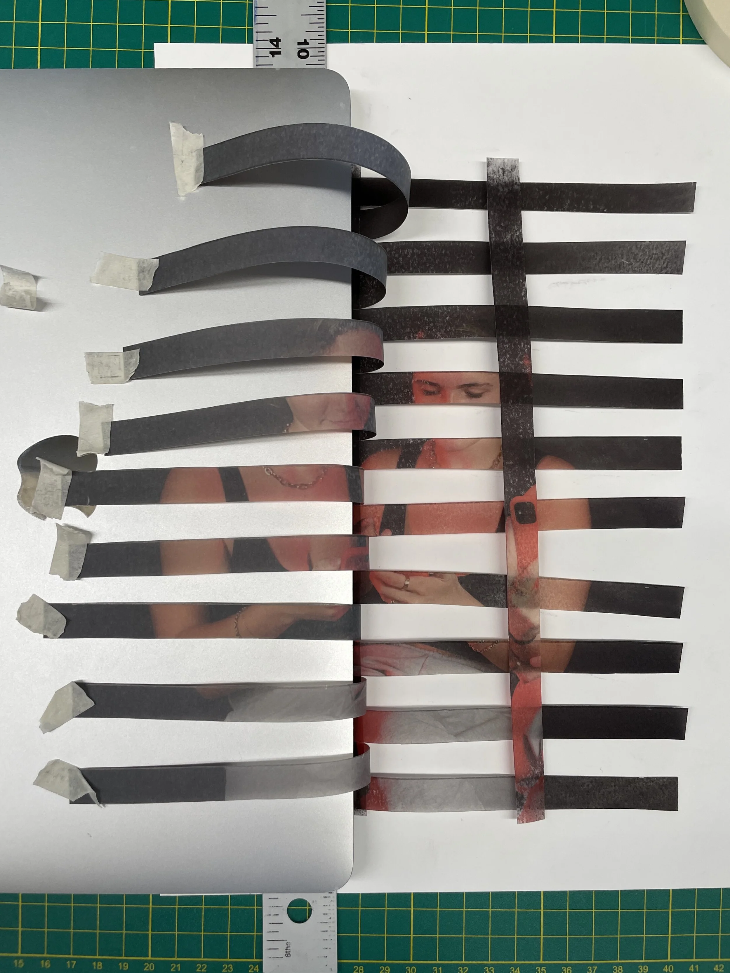 *Hack* As you go along, you might find it useful to use a weight to hold everything down. I used my laptop over a ruler, and taped every other horizontal strip onto my laptop so I can easily slide a vertical strip.